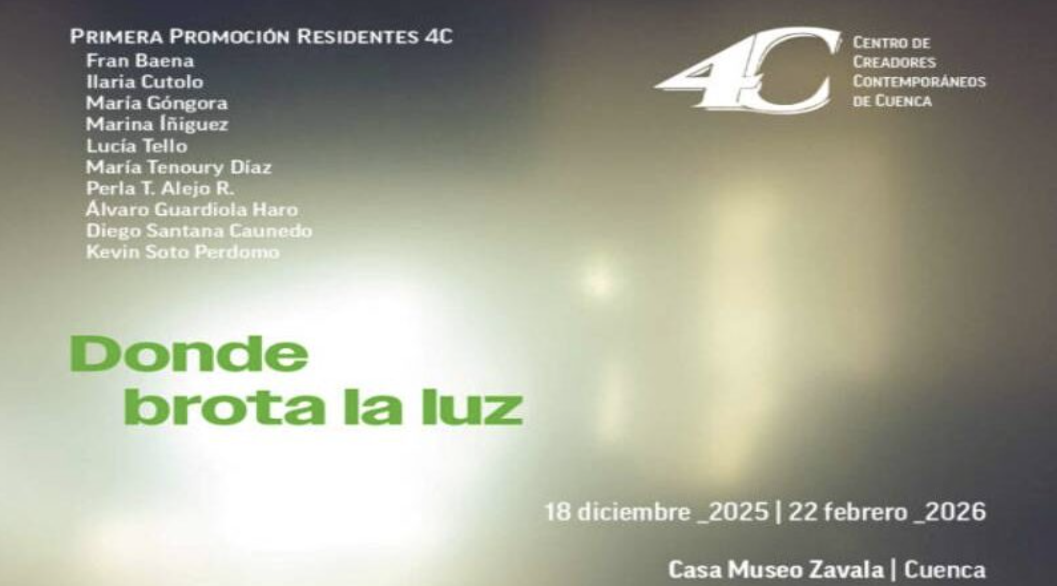 El Museo Casa Zavala presenta, el jueves 18 de diciembre, la exposición Donde Brota la luz, muestra de la primera promoción de Residentes del Centro de Creadores Contemporáneos de Cuenca, 4C, Fundación Antonio Gala, en colaboración con la Fundación Antonio Pérez y comisariada por Isis Saz.